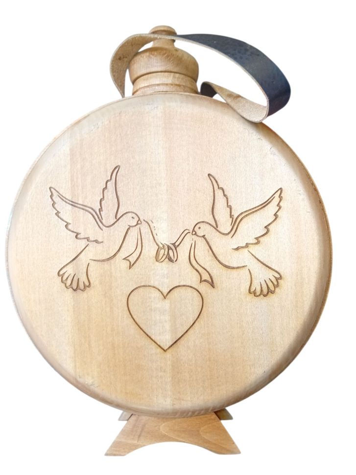 Стъклена бъклица 700 мл с лаково покритие и декорация с гълъби – символ на любов и вярност.