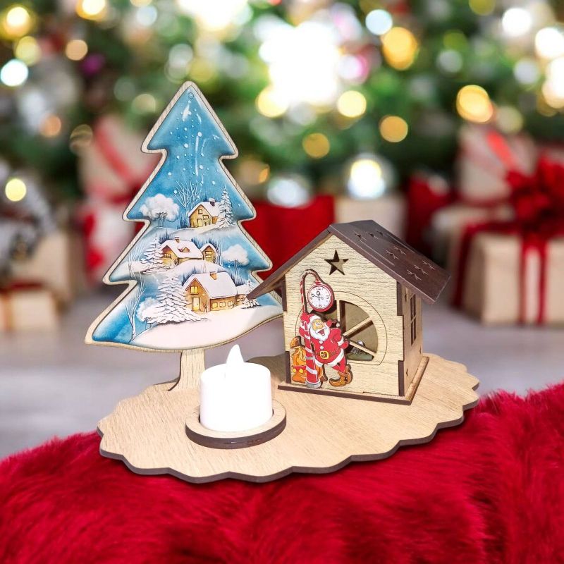 Създайте топла и празнична атмосфера с тази красива декорация на поставка, включваща светеща къщичка и елхичка.