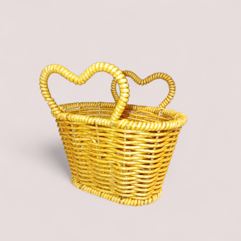 Тази стилна метална кошница с плетка от гумиран шнур и сърцевидни дръжки е чудесен избор за декорация или оригинален подарък.