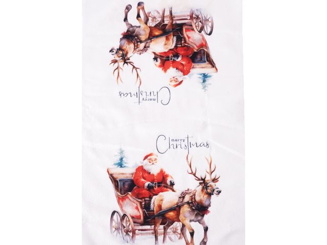 Коледна кърпа 30/50 см с мотив Дядо Коледа с файтон – празничен аксесоар за кухнята или трапезата.