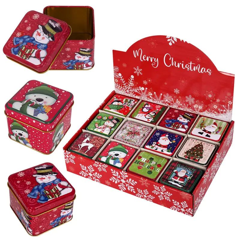 Коледна метална кутия с капаче с размери: 7,5 х 7,5 х 6,5 см.