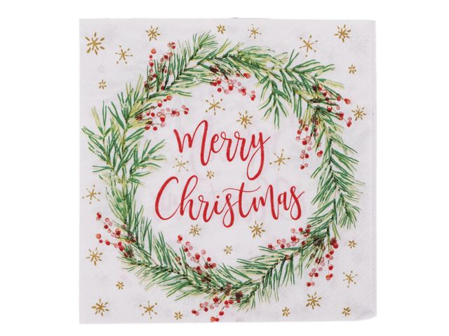 Комплект коледни салфетки 33×33 см, 20 бр., с мотив Весела Коледа – празничен аксесоар за масата, който добавя коледно настроение и стил на декорацията.