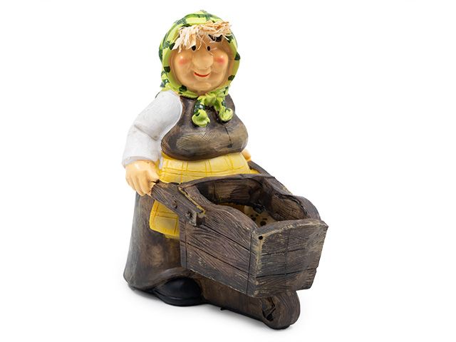 Градинска декорация кашпа „Баба с количка“ с височина 18 см – очарователен декоративен елемент за градината, терасата или балкона.