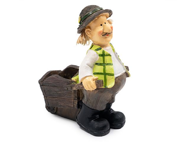Градинска декорация кашпа „Дядо с количка“ с височина 18 см – стилна и забавна фигура за градината, терасата или балкона.