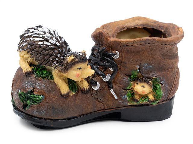 Градинска декорация кашпа „Таралежи и кубинка“ с размери 22×12 см – симпатична и оригинална фигура за градината, балкона или терасата.