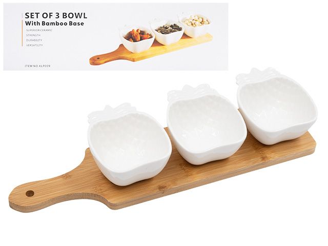 Комплект от 3 купи с поставка и дъска с размери 11,5×9×5 см, декорирани с мотив ананас – стилна и практична декорация за дома, кухня или трапезата.