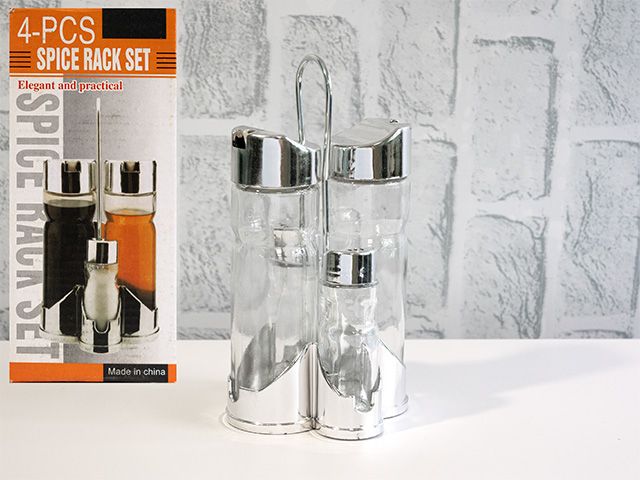 Оливерник 4-ка НИК – практична поставка с четири стъклени бутилки за олио, оцет, сол и пипер, снабдена с метална дръжка за удобно пренасяне.